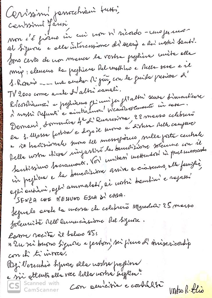Sono certo che non manca la vostra preghiera unita alla mia: almeno la preghiera del mattino e della sera e Santo Rosario….. ma anche di più con la guida preziosa di TV2000 come anche di altri canali.